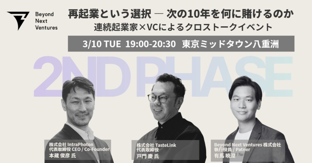 | 登壇者 | 株式会社IntraPhoton 代表取締役CEO 本蔵 俊彦氏 株式会社TasteLink 代表取締役 戸門 慶氏 当社 執行役員/パートナー 有馬 暁澄 |